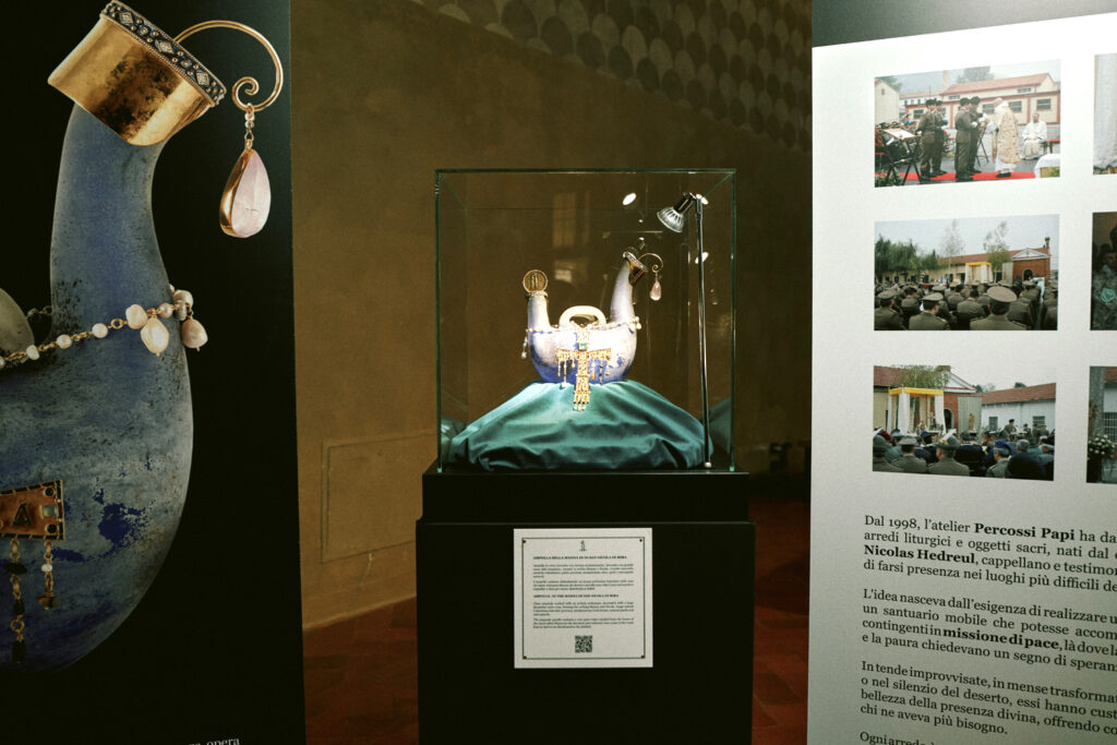 L’esposizione ha presentato una selezione di tesori liturgici e oggetti sacri realizzati dal nostro atelier su ispirazione di Don Nicolas Hedreul, sacerdote che ha immaginato una cappella da campo itinerante, capace di accompagnare i soldati nelle missioni di pace.