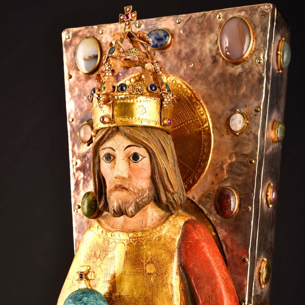 Ai piedi del Cristo si apre un piccolo portale, emblema delle porte della Gerusalemme celeste, che custodisce al suo interno una teca-pisside per le ostie consacrate, il “pane del cielo” evocato nel Vangelo di Giovanni (6, 32-35).