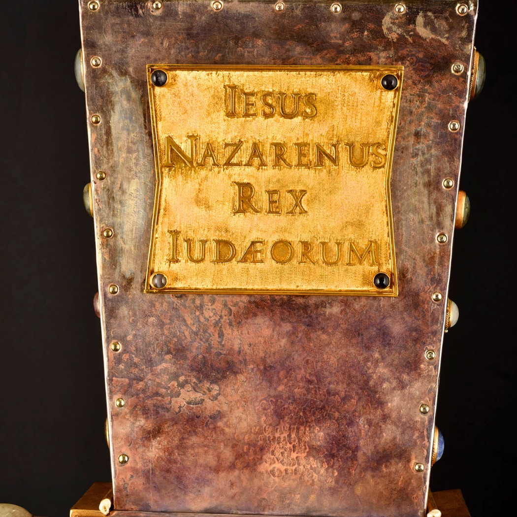 Grande croce astile in legno, rivestita da una lamina d’argento e impreziosita da elementi in tecnica cloisonné e pietre naturali.