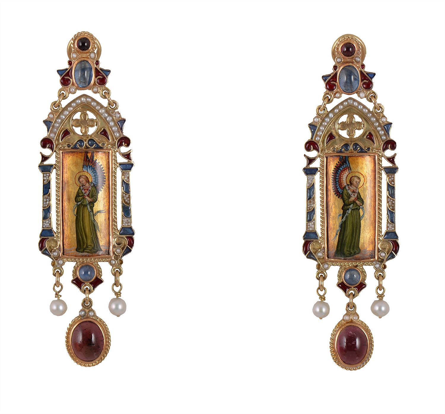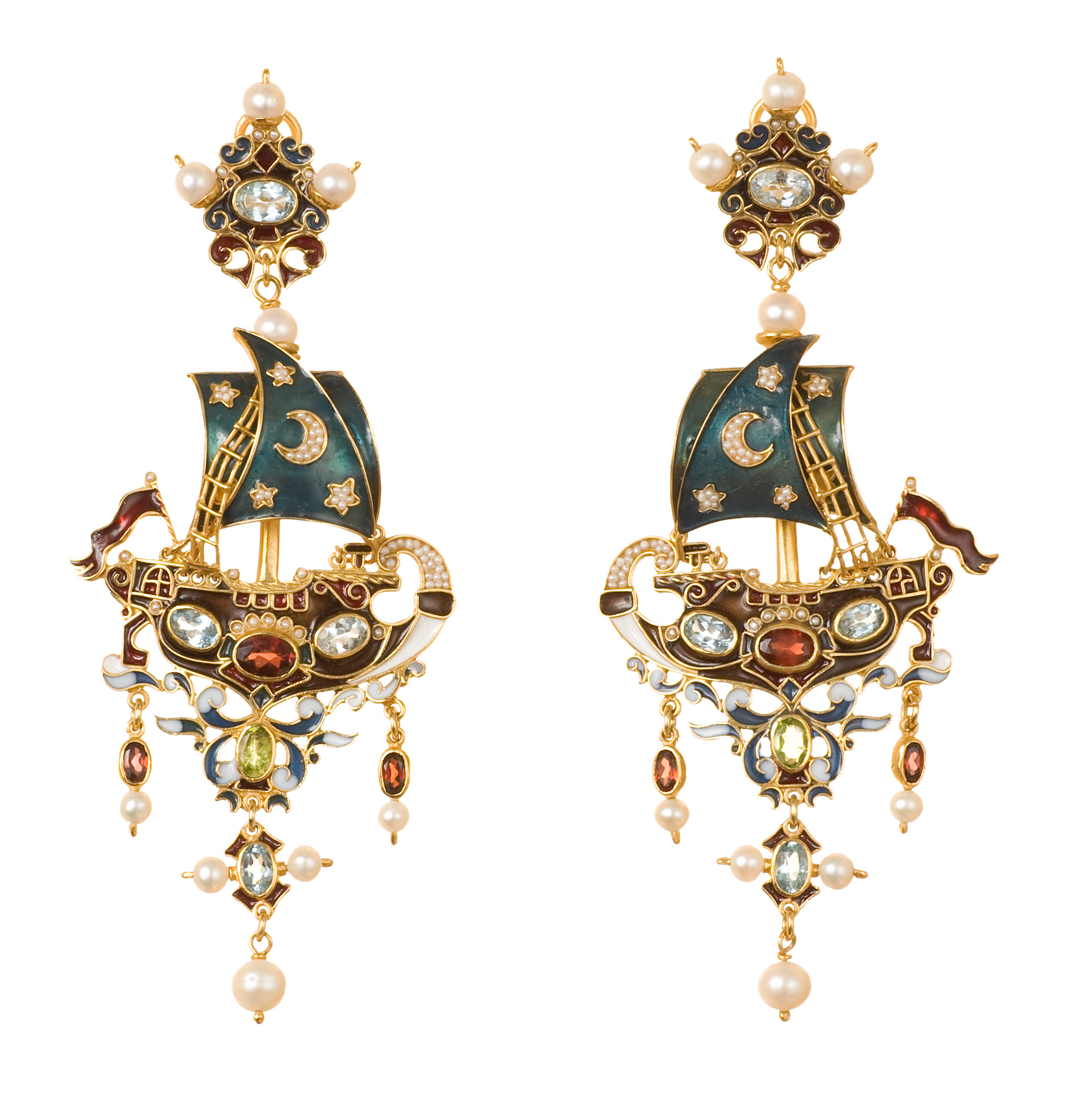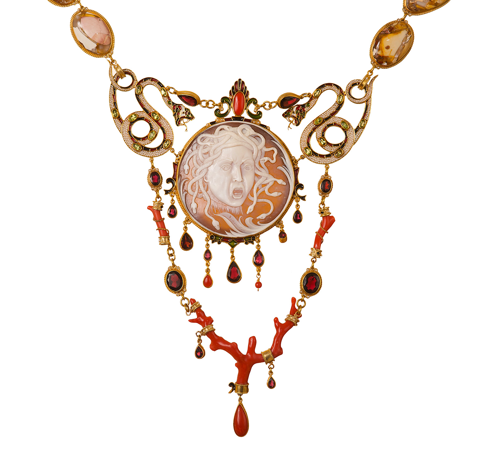 Percossi Papi’s creations are among those unique pieces he treasured and safeguard, and that’s for transfer to the next generations. Each piece is a marvellous melting pot of suggestions, recalls and allusions, more or less evident, or the journey of beauty on which humanity has embarked since it felt the need of wearing a jewel before a dress. Firstly there was the shell, then coloured glass, gold, coral, the unusual representing the sublime thus fulfilling religious need, a symbol of royal power, of distinction and then more and more a fragment of a divine power shared by all, as a small concentration of positive energy against the world of evil. A spiritual, rather than material kind of survival. The creations of this goldsmith who works next to the Pantheon in Rome, the house of all Gods, the geographic centre of the antique world, keep this intrinsic energy of relics connecting to something higher, to a realm where destiny flows and the coloured stones seem the bed of a river where people are immersed in an Heraclitean way. Percossi Papi, collector himself since 1968, continues endlessly to gather precious stones, parting the beautiful from the ordinary. An ongoing act of separation and re-composition, that has much in common with the word ‘ethics’. He can be compared to an artist who has still the cheerfulness of a child looking for coloured glass pieces on the beach, to use as inspirations for his fine jewellery creations. His glittering caravels, so special and at the same time so traditional and symbolical, seem on a perennial journeys through the waters of an infinite ocean, called mystery. Baroque is the right term to describe the exuberance, the inner ‘wunderkammer’, the research for something “scaramazzo” unusual, enjoyable – that goes out of the track. Percossi Papi preserves a mystical, sacral approach towards objects: an attitude that aims at their essence. An elective affinity between himself and the world around him. Whoever wears his cameos, his animals that come from an antique bestiary, from Phisilogus, his miniatures that recall Russian and Byzantine icons or Medieval splendours, has his same approach: believing that the object of art is a fragment of a language we try to decipher, a synthesizer of energies, capable of concretizing the past in the present. In the eyes of Percossi Papi, Medusa, the Libyan Gorgon who loved Poseidon in Athena’s temple and because of that was transformed in a terrible monster by the Goddess, with snakes as hair, long teeth and an hypnotic, petrifying stare, becomes a contemporary symbol, an outcry in support of diversity, of cultural strength, of beauty’s victory on the true hideousness of ignorance and dishonesty. His Medusa, in fact, rather than frightening, seems to allure with the power of her judging glare, that never lies, and expresses her horror for everything without a past, without traditions, without beauty.